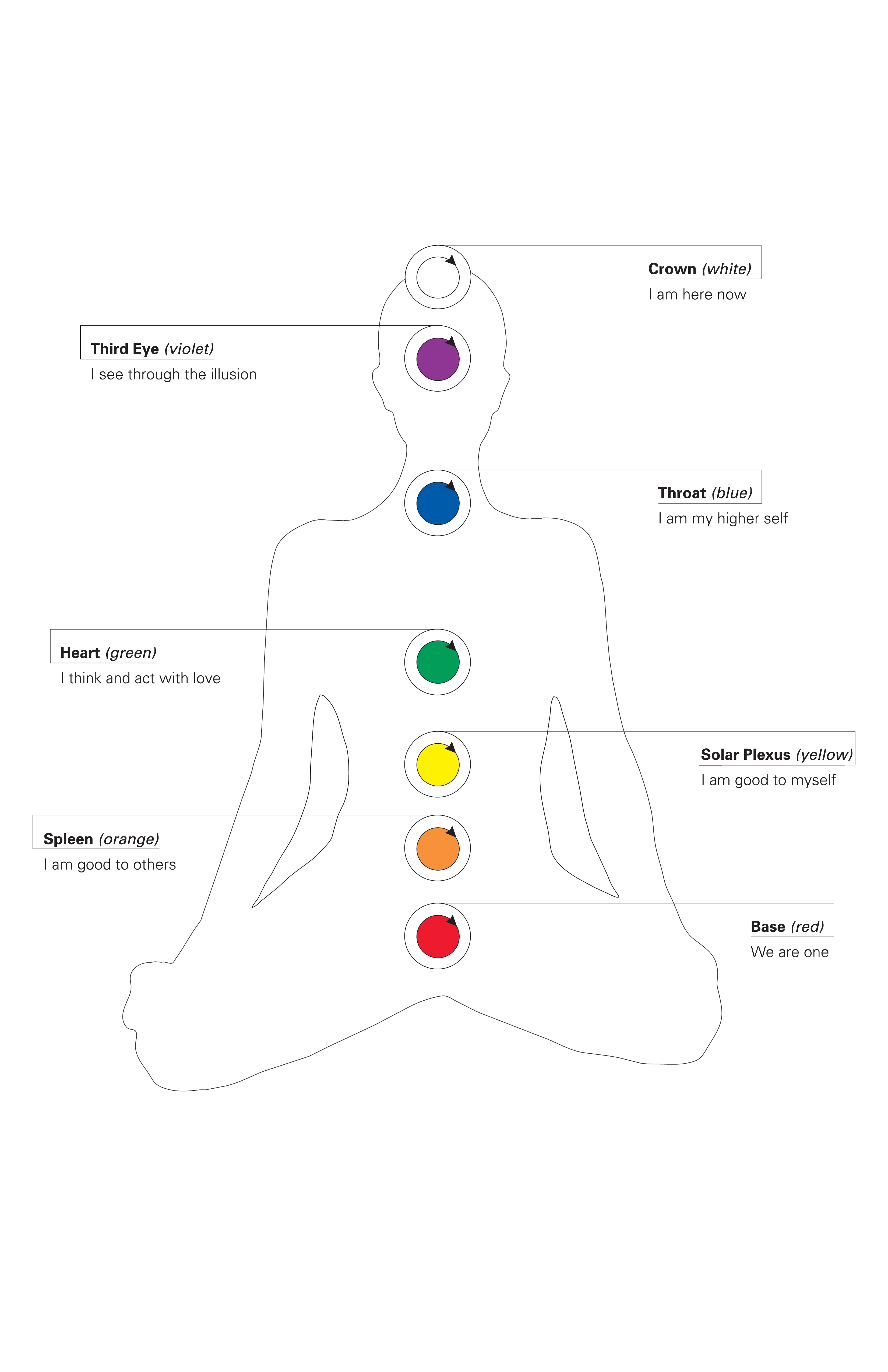You’ll need seven cards corresponding to the seven colors of the spectrum and the seven charkas; red, orange, yellow, green, blue, purple and white. I, Tony, use small cards, about the size of business cards; I, Cristina, like big ones the size of index cards, but any size will do. We made our cards by painting them with acrylic paints and then taking them to Kinko’s to be laminated. We used acrylics because we had them around and they dry quickly, but if you don’t have paints in the house or don’t want to make your own, you can use the color cards printed in the back of our book, Tony&Tina Color Energy. And we have a limited number of Colorcard sets in our shop. Colors stationary paper works too. Each color card has its chakra meaning on the back.